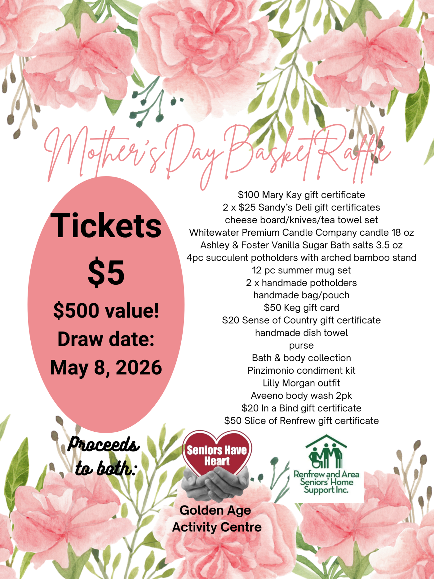 Proceeds to BOTH Renfrew and Area Seniors’ Home support & Golden Age Activity Centre