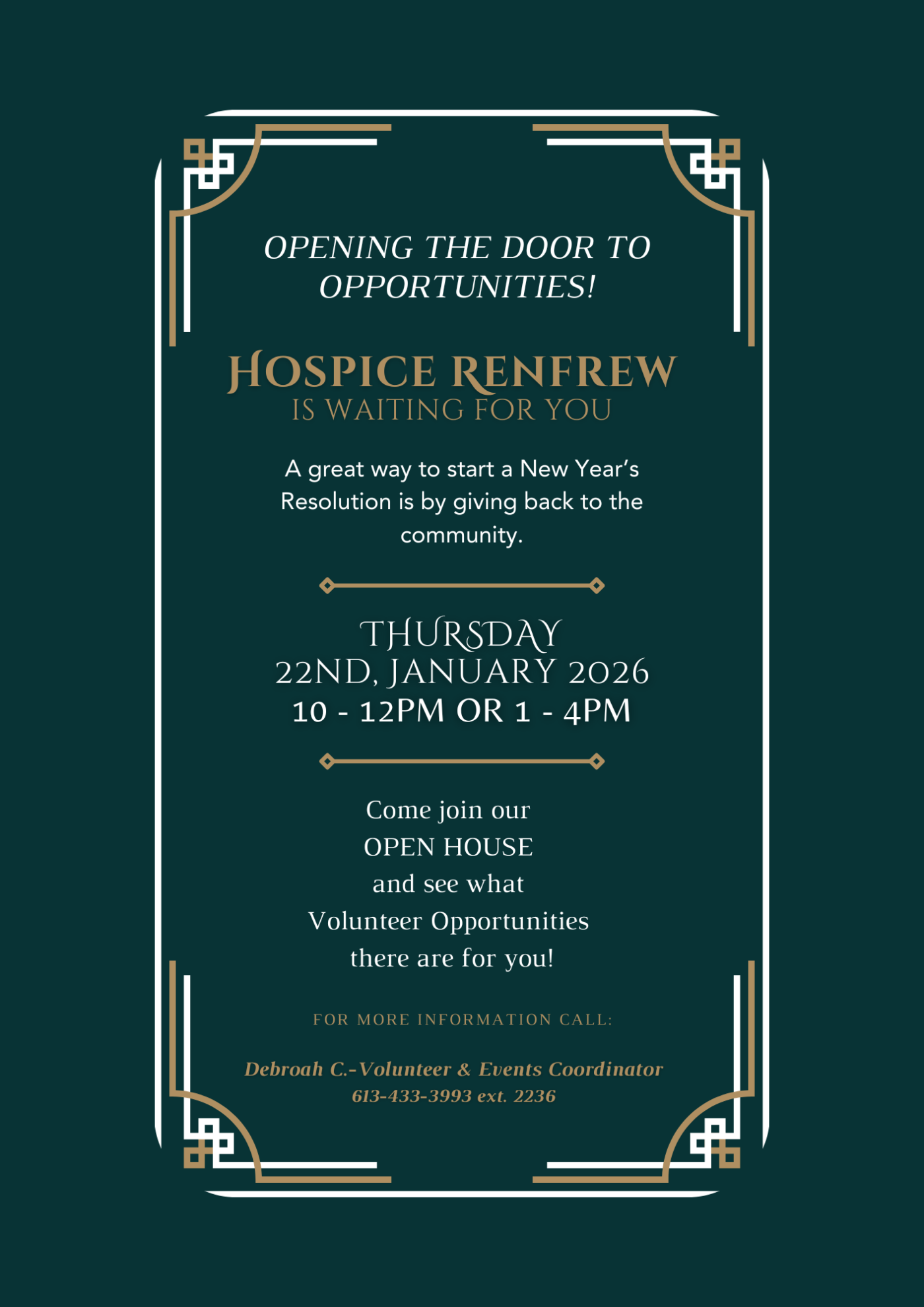 Open the door to opportunity with Hospice Renfrew. Giving back to your community is a powerful way to start the New Year. Open house starts at 10:00 - noon and 1:00 - 4:00 pm. Volunteer & Event Coordinator Debroah will be on hand to answer all of your questions. For more information call: 613-433-3993 X 2236