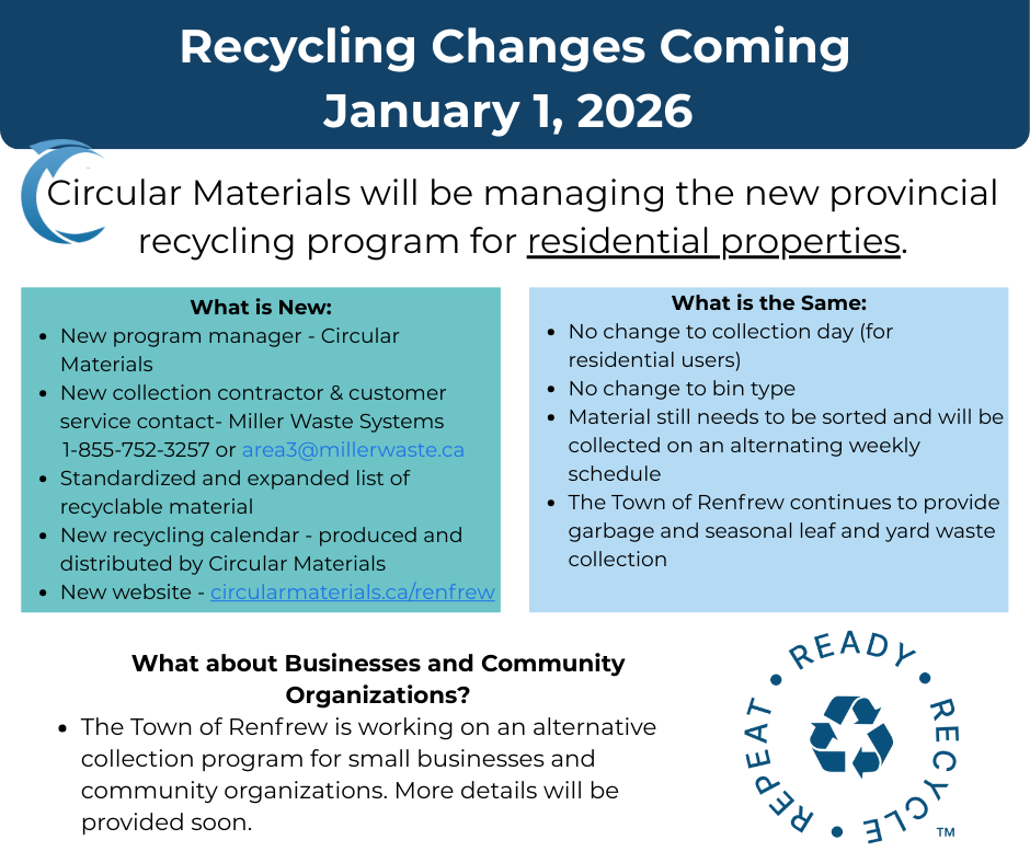 The Town of Renfrew is working on an alternative recycling program for non-residential units. More info will be provided soon on our website and socials; BIA and Chamber of Commerce Members will receive an email with full details when available.